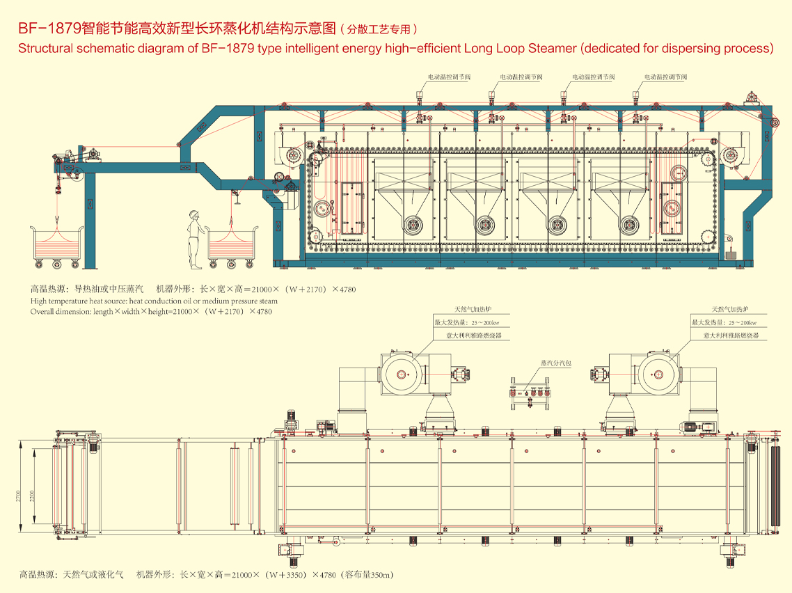 2、主蒸化箱體:主要包括進布汽封箱、汽蒸箱頭段和汽蒸箱尾段以及多個中段(每個中段容布量70米:兩個循環風機、兩個熱交換器、兩套蒸汽加濕噴嘴等)、帶蒸汽加熱的頂部、帶照明的觀察窗、成環進布輥、成環機構、鏈條軌道、掛布輥軌道、掛布輥、主傳動、帶容布量探測器的出布調速裝置、出布汽封箱、離心排風機等;