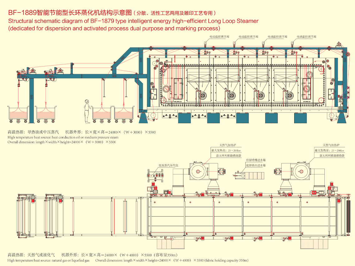 2、在成環處約1米長度空間處的正下方,單獨設計飽和蒸汽大供應量的噴汽裝置,使織物在工藝反應時得到大量的、充足的飽和蒸汽使織物發色更充分、更鮮艷;