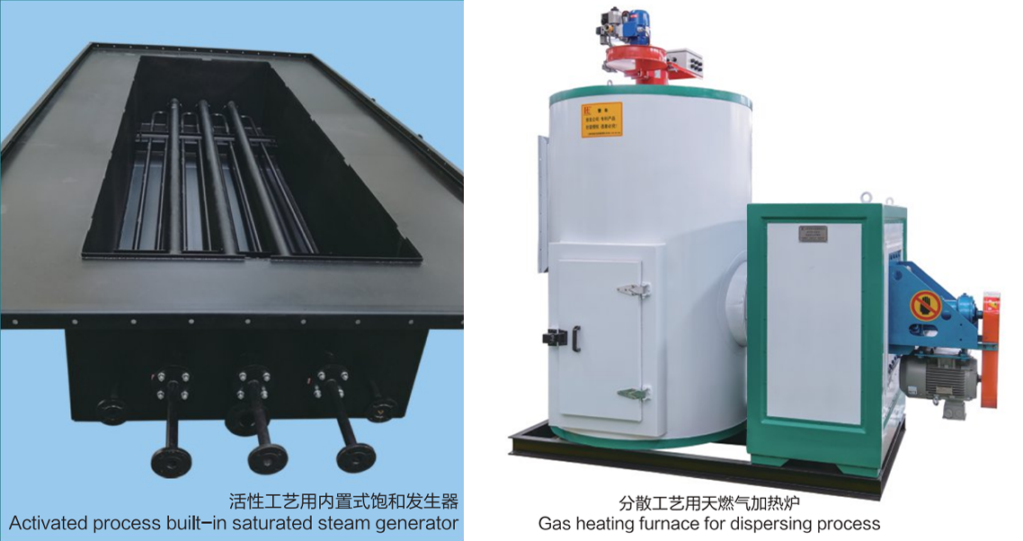 2、活性工藝:在分散工藝溫度恒定的配置基礎上,快速升溫至102℃左右的活性工藝時,獨特的飽和蒸汽發生器開始發揮其含濕量最大的特點,含濕量最大的蒸汽以最近最快的方式通過循環風機均勻的輸入蒸箱內,使蒸箱內的織物充分吸濕,當然同時放熱,在放熱過程中,蒸箱內溫度上升,這時蒸箱內多個測溫點同時啟動加濕裝置,超細而大量的將汽霧在循環風機作用下一起補充至蒸箱內,既平衡了設定的工藝溫度又恒定了蒸箱內的較大濕度;使布面發色充分,花型鮮艷而飽滿。